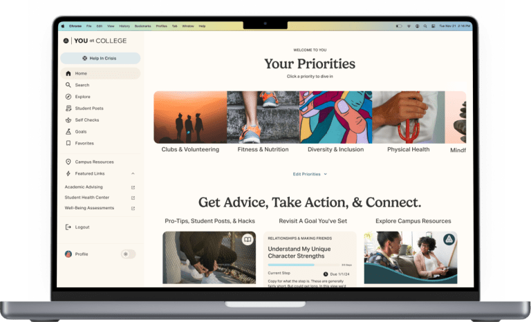 Built on years of primary and secondary research, the YOU platform was developed by behavioral health experts as a scalable and effective solution for higher ed. Click below to learn more about YOU, and connect with us to explore how our research-backed technology powers steadfast behavior change for students at any institution.