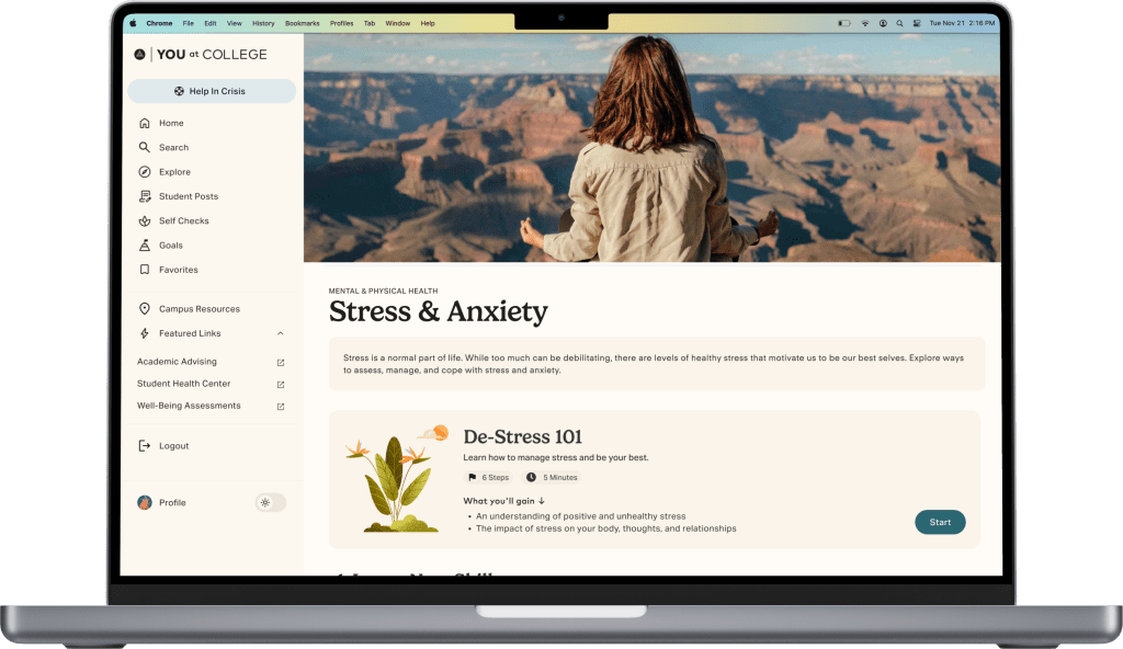 Fostering student mental health and well-being has always been a top priority for us at YOU at College, which is why we built YOU for Students: a comprehensive, personalized well-being and student success digital tool. YOU for Students is grounded in our awareness of the complexity of the student experience: a student’s academic and career success is inextricably linked with their mental and physical health, their overall well-being, and their sense of belonging and connection on campus. The YOU platform provides students with 24/7 access to resources that support them in each of these areas; through evidence-based articles, self-assessments, skill-building tools, student testimonials, and integrated campus resources, students can find everything they need in one easy-to-use, personalized digital tool. As one first-year, first-generation student said, “YOU serves as a hub of resources that can be used to explore how to manage any stress or concern related to personal, academic, and financial life. The articles, videos, and guides [offer] new perspectives, and strategies to overcome problems.”